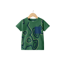 Explore comfort and style with this unique forest green t-shirt. Made from soft, durable pure knitted cotton, this tee offers excellent breathability and comfort for active kids. The design features an abstract map contour or topographic-style print in dark navy and light gold/yellow, which subtly integrates the repeating text "Coolest Buddy" al..