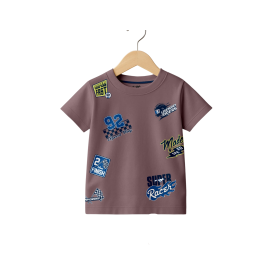 Fuel your little racer's wardrobe with this cool, patch-style graphic tee. Made from super soft and comfortable pure knitted cotton, this t-shirt is designed for high-speed playtime and all-day comfort. The unique mauve/dusty brown color serves as a stylish background for a collection of racing-themed graphics scattered across the front. These "..