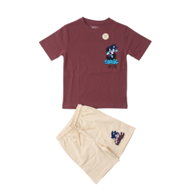Power up his wardrobe with this officially licensed Sonic the Hedgehog two-piece set for boys. This outfit includes a comfortable, maroon crewneck t-shirt and coordinating beige drawstring shorts. The t-shirt features a dynamic full-chest graphic of Sonic in action, accompanied by text that reads "SONIC THE HEDGEHOG" and his famous catchphrase. ..