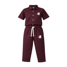 A versatile and stylish unisex loungewear set inspired by Korean streetwear aesthetics. This deep wine maroon ensemble features a short-sleeved button-down polo and matching relaxed-fit trousers with an elastic drawstring waist. The minimalist design is accented by a white flame "A" emblem on the chest and leg, making it a perfect comfortable choic..