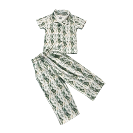 Elevate your little one’s daily style with our Premium Ribbed Co-ord Set. Crafted from an ultra-soft, breathable ribbed fabric, this two-piece outfit features a modern moss green abstract print that blends camouflage vibes with artistic flair. The set includes a short-sleeve, button-down shirt with a classic camp collar and matching wide-leg tro..