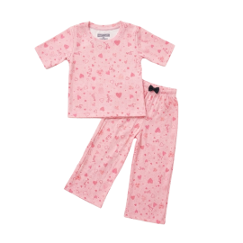 Ribbed Pajama Set for Girls-Pink Heart Print