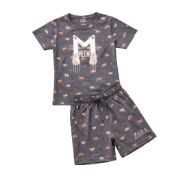 Girls' Charcoal Grey "Meow" Cat Print T-Shirt and Shorts