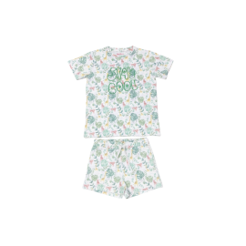 Keep her comfortable and trendy with our Girls' Safari "Stay Cool" Coord Set. This playful two-piece set features a charming all-over tropical print filled with monstera leaves, giraffes, and cheetahs in soft pastel tones. The short-sleeve top is highlighted by a glittery green "Stay Cool" graphic, adding a touch of sparkle to her bedtime rout..