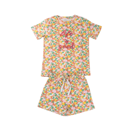 Brighten her day with this cheerful and vibrant two-piece outfit. Featuring an all-over playful abstract camo-style print in shades of peach, yellow, and green, this set is designed for maximum style and comfort. The short-sleeve tee features a beautiful "Life is Good" script in raised pink embroidery, adding a touch of texture and positivity. P..